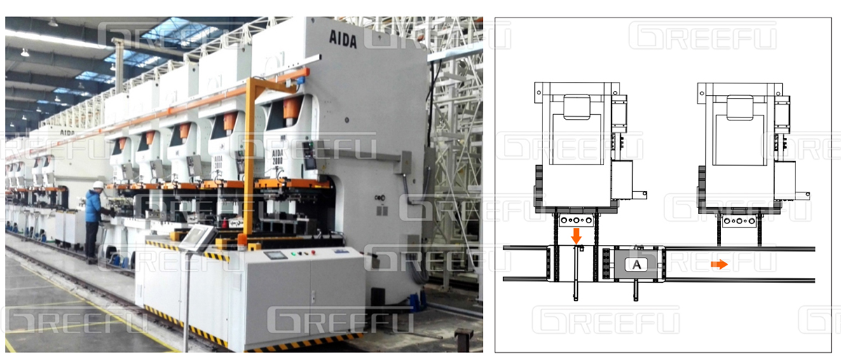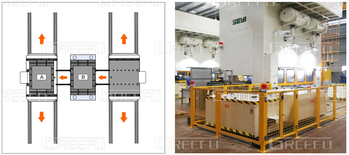 多臺(tái)沖床共用一套自動(dòng)換模臺(tái)車系統(tǒng),該“自動(dòng)換模臺(tái)車系統(tǒng)”能有效解決大型模具的換模作業(yè),如汽車鈑金、家電電梯等行業(yè)沖壓零件,且格萊富可依各種獨(dú)立作業(yè)需求研究開發(fā)各種搬運(yùn)臺(tái)車,并可設(shè)計(jì)單鍵全自動(dòng)或半自動(dòng)對(duì)模具的搬入搬出,同時(shí),現(xiàn)在該模具輸送系統(tǒng)也已逐漸被業(yè)內(nèi)接受與采用,尤其是,汽機(jī)車零組件等需大型模具的制造業(yè)等。